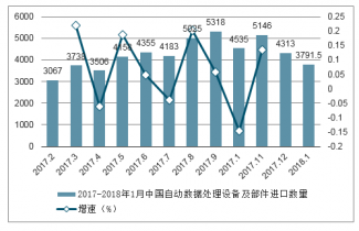 2017-2018年1月中國自動數(shù)據(jù)處理設(shè)備及部件進口數(shù)量