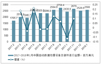 從中國自動數(shù)據(jù)處理設(shè)備及部件進口額來看,2018年1月中國自動數(shù)據(jù)處理設(shè)備及部件進口金額2588百萬美元,同比增長29.4%。