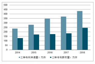 2014-2018年中國三種專利授權(quán)量、申請(qǐng)量走勢(shì)