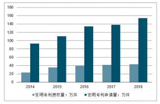 2014-2018年中國發(fā)明專利授權(quán)量、申請(qǐng)量走勢(shì)