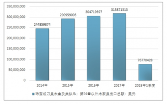 2016年我國珠寶或刀具木盒及類似品;第94章以外木家具出口總額304719697美元,2017年出口總額315871313美元;2019年1季度出口總額76770428美元。