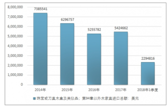 2014-2018年1季度珠寶或刀具木盒及類似品;第94章以外木家具進口貿(mào)易總額走勢圖(單位:美元)