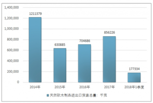 2014-2018年1季度天然軟木制品進(jìn)口貿(mào)易總量走勢圖(單位:千克)