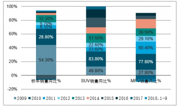 2009-2018年中國(guó)汽車細(xì)分市場(chǎng)銷量增速對(duì)比(單位:%)