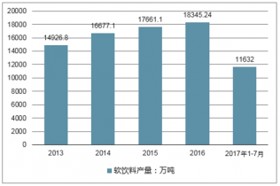 2017年1-7月中國軟飲料產(chǎn)量為11632萬噸,同比增長7.3%;2016年中國軟飲料產(chǎn)量為18345.24萬噸,同比增長1.9%。