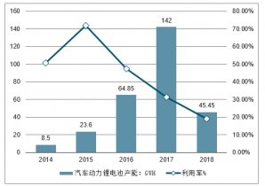 2014-2018年第.一季度中國汽車動力鋰電池產(chǎn)能及利用率情況