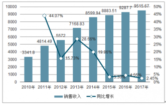 近年來,我國(guó)宏觀經(jīng)濟(jì)發(fā)展轉(zhuǎn)入適度增長(zhǎng)階段,調(diào)整產(chǎn)業(yè)結(jié)構(gòu),轉(zhuǎn)變發(fā)展方式,“穩(wěn)中求進(jìn)”是我國(guó)經(jīng)濟(jì)社會(huì)發(fā)展的主旋律。水泥制品行業(yè)發(fā)展速度已由高速轉(zhuǎn)為較快的適度增長(zhǎng)。2017年,水泥制品制造行業(yè)銷售收入為9515.67億元,同比增長(zhǎng)2.45%。