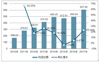 2010-2017年水泥制品制造行業(yè)利潤(rùn)總額及增長(zhǎng)(億元)