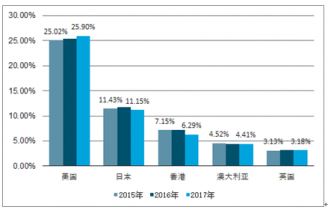 2015年-2017年中國(guó)塑料包裝箱及容器及其附件對(duì)外出口主要國(guó)家和地區(qū)及其占比情況