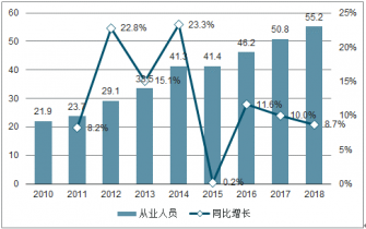 2010-2018年中國工程造價(jià)咨詢行業(yè)從業(yè)人員數(shù)量及增速