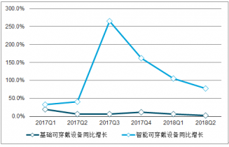 2017Q1-2018Q2中國(guó)基礎(chǔ)及智能可穿戴設(shè)備出貨量同比增長(zhǎng)