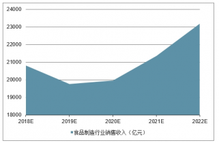 2019年我國食品制造行業(yè)銷售收入將達到20,806億元,未來五年(2018-2022)年均復合增長率約為2.73%,2022年將達到23,177億元。