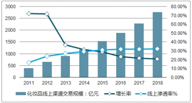 2011-2018年中國(guó)化妝品線上渠道交易規(guī)模及滲透率走勢(shì)