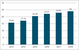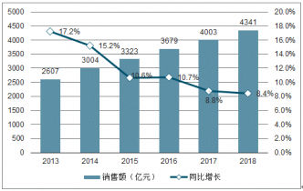 2013-2018年中國藥品零售市場銷售額及增長