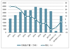 2010-2018年中國肉制品行業(yè)產(chǎn)量及同比增長走勢