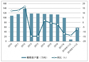 2010-2018年中國葡萄酒產(chǎn)量及同比增長(zhǎng)走勢(shì)