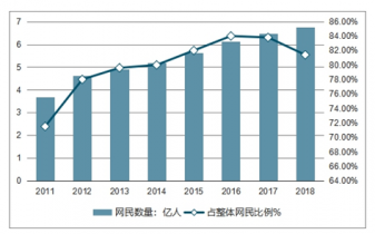 2011-2018年中國互聯(lián)網(wǎng)網(wǎng)絡(luò)音樂用戶規(guī)模及占整體網(wǎng)民比例情況