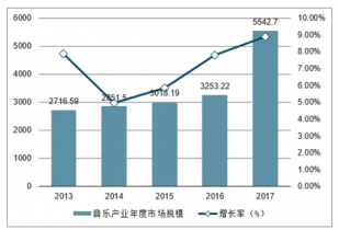 2013-2017年中國音樂產(chǎn)業(yè)年度市場規(guī)模及增速分析