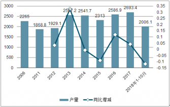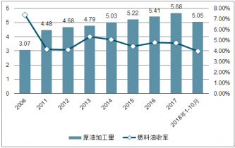 2006-2017年,燃料油產(chǎn)量從2265萬噸增長到2693萬噸,增長18.90%,總體呈平穩(wěn)增長趨勢,同一時期中國原油加工量從3.1億噸增加到5.68億噸,增長74.52%,而燃料油收率從7.31%下降到4.74%,下跌35.11%,隨著煉油能力的增加,燃料油收率總體呈現(xiàn)下降趨勢。