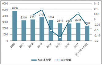 近十幾年,受節(jié)能減排政策、替代清潔燃料發(fā)展和地方煉廠獲得的原油資源量增加等因素的影響,中國燃料油消費(fèi)量在震蕩中下行。總體上看,2006-2017年,中國燃料油表觀消費(fèi)量從4806萬噸下降到2941萬噸,下跌38.81%。2011-2013年,中國燃料油表觀消費(fèi)量持續(xù)上漲,主要得益于地方煉廠產(chǎn)能擴(kuò)張導(dǎo)致對原料需求增長,2013年達(dá)到最近幾年的峰值3770萬噸。2014年,地方煉廠因獲得的進(jìn)口原油使用配額大量增加,其原油加工比例明顯提高,加之稀釋瀝青等替代原料的大量使用,地方煉廠對燃料油需求下滑,帶動燃料油表觀消費(fèi)量較大幅度下跌。隨著地方煉廠燃料油使用量跌至冰點(diǎn),經(jīng)過2015年、2016年的徘徊趨穩(wěn)后已有小幅反彈,2017年消費(fèi)量為2941萬噸,較2016年2780萬噸增長4.10%。