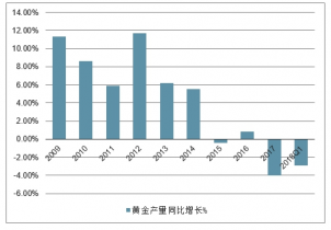 2009-2018年中國(guó)黃金產(chǎn)量及同比增長(zhǎng)走勢(shì)