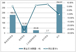 2019年一季度,我國(guó)黃金首飾180.50噸,同比增長(zhǎng)5.60%;金幣2.70噸,同比增長(zhǎng)8.00%;工業(yè)及其他28.49噸,同比增長(zhǎng)6.58%;唯一下降的是金條的消費(fèi)量,為73.28噸,同比下降27.58%。