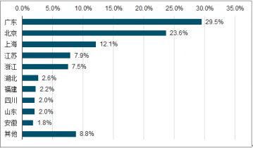 從服務(wù)機(jī)器人企業(yè)分布領(lǐng)域來看,中國服務(wù)機(jī)器人多分布在廣東、上海、江蘇等沿海地區(qū),其中,多集中于廣東、北京、上海,三者企業(yè)數(shù)量占比分別為29.5%、23.6%、12.1%;此外,江蘇、浙江占比分別為7.9%和7.5%,均排在靠前位置。