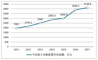 2016年我國(guó)汽車電子控制裝置市場(chǎng)規(guī)模為3909.5億元,2017年我國(guó)汽車電子控制裝置市場(chǎng)規(guī)模增長(zhǎng)至4138.9億元。