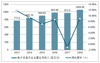 2013-2018年中國電子設備行業(yè)主營業(yè)務收入及同比增長走勢