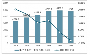 2013-2018年中國電子設備行業(yè)利潤總額及同比增長走勢