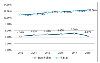 2013-2018年中國電子設備所屬行業(yè)毛利率及銷售利潤率走勢