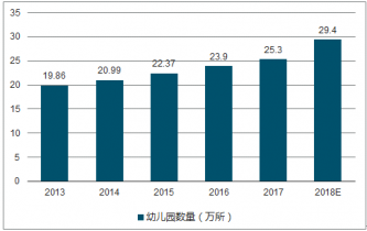 近年來,我國學(xué)前教育事業(yè)發(fā)展較快,幼兒園數(shù)、在園幼兒數(shù)、幼兒園教職工數(shù)量均有增加,學(xué)前教育毛入園率也有較大提高。2013年,我國共有幼兒園1986萬所,同比增長9.54%。預(yù)計(jì)2018年中國幼兒園數(shù)量將達(dá)到29.4萬所。