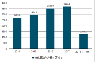 2019年1-4月中國液化石油氣產(chǎn)量為1269.1萬噸,同比增長7.9%;2017年1-12月中國液化石油氣產(chǎn)量為3677.3萬噸,同比增長4.5%。