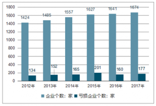 2012-017年中國(guó)塑料管道行業(yè)企業(yè)量與虧損企業(yè)數(shù)量走勢(shì)