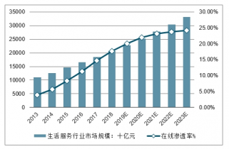 2013-2023年中國生活服務行業市場規模及在線滲透率預測