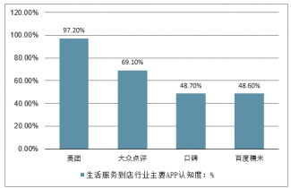 從用戶認知度來看,美團認知度最高,行業用戶認知度高達97.2%;大眾點評的認知度接近七成,位于行業第二;第二梯隊的口碑和百度糯米的認知度差不多,接近五成。