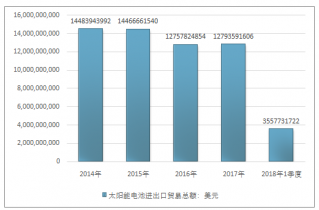 2016年我國(guó)太陽(yáng)能電池進(jìn)出口貿(mào)易總額12757824854美元,2017年進(jìn)出口貿(mào)易總額12793591606美元;2018年1季度進(jìn)出口貿(mào)易總額3557731722美元。