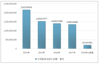 2016年我國(guó)太陽(yáng)能電池進(jìn)口總額1400537980美元,2017年進(jìn)口總額1348124686美元;2018年1季度進(jìn)口總額201447802美元。