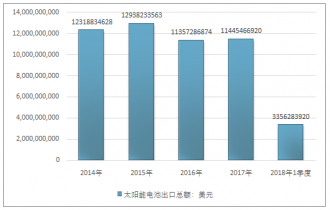 2016年我國(guó)太陽(yáng)能電池出口總額11357286874美元,2017年出口總額11445466920美元;2018年1季度出口總額3356283920美元。