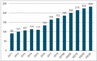 近年來(lái),隨著產(chǎn)品技術(shù)的不斷成熟與創(chuàng)新,產(chǎn)品的應(yīng)用性、操作性也越發(fā)簡(jiǎn)便,投影機(jī)已經(jīng)逐漸變成了教育、商務(wù)必備,甚至將觸角伸向家庭使用。2011年以來(lái),我國(guó)投影機(jī)市場(chǎng)銷(xiāo)售額呈現(xiàn)不斷增長(zhǎng)的態(tài)勢(shì)。2011年,投影機(jī)市場(chǎng)銷(xiāo)售額約為92億元;至2017年,中國(guó)投影機(jī)市場(chǎng)銷(xiāo)售額達(dá)165億元,同比增長(zhǎng)22.5%。到2023年,中國(guó)投影機(jī)市場(chǎng)銷(xiāo)售額有望達(dá)到234億元。