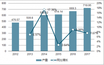 2012-2017年中國建筑涂料產(chǎn)量及增長率(萬噸)