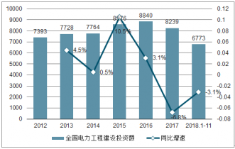 2012-2018年全國電力工程建設(shè)投資額及增速