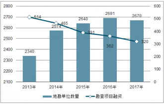 2013-2017年地勘單位數(shù)量與勘查項(xiàng)目融資規(guī)模(億元)