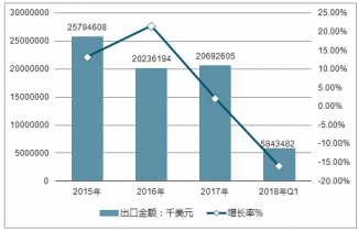 2015-2018年Q1中國船舶出口金額及增長走勢