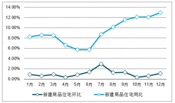 2019年1-12月新建商品住宅方面價格同比增長及環(huán)比增長走勢