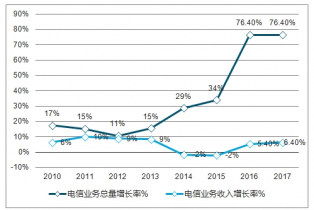 2010-2017年中國(guó)電信業(yè)務(wù)總量及收入增長(zhǎng)走勢(shì)