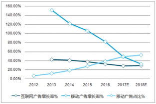 2012-2018年中國互聯(lián)網(wǎng)廣告及移動廣告市場規(guī)模增長率