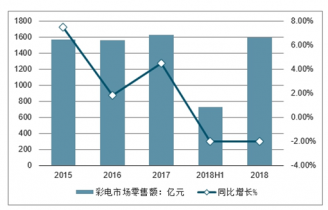 2015-2019年中國(guó)彩電市場(chǎng)零售額及同比增長(zhǎng)走勢(shì)