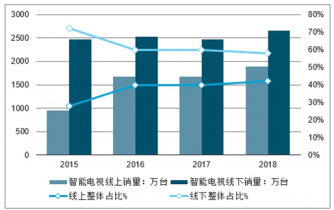 2015-2019年中國智能電視線上、線下年度銷量情況