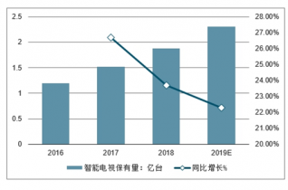 2016-2019年中國智能電視保有量及同比增長走勢